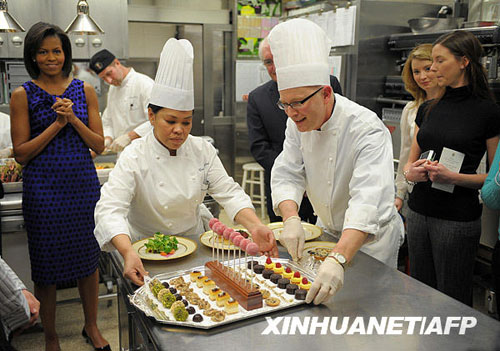 2月22日,在美國華盛頓白宮的廚房里,美國“第一夫人”米歇爾·奧巴馬(左)探望為宴請州長的晚餐而忙碌的廚師們。新華社/法