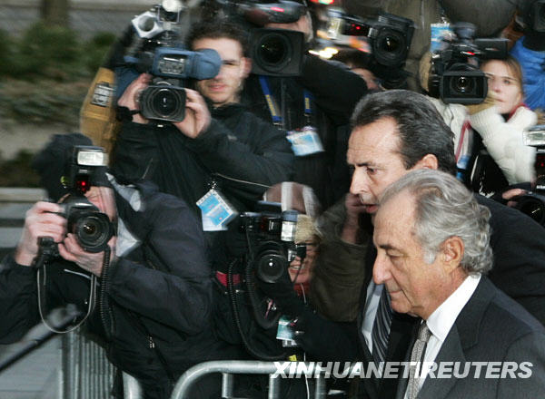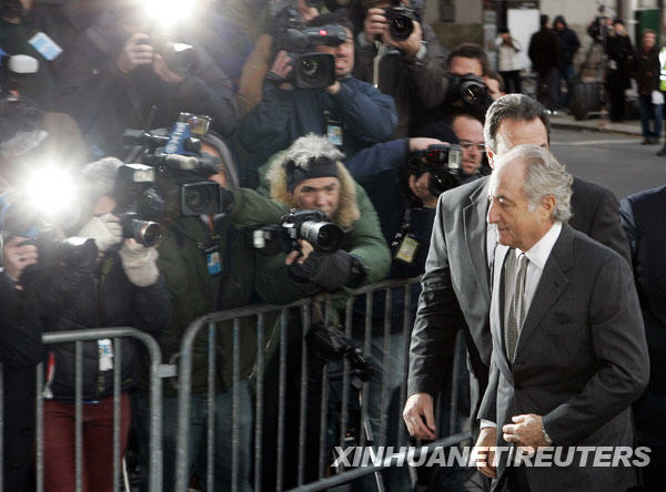 3月12日,在美國紐約,美國巨額金融詐騙案嫌疑人伯納德·麥道夫(右)抵達(dá)聯(lián)邦法庭準(zhǔn)備出庭。麥道夫的律師艾拉·索金10日在法庭上說,麥道夫擬于12日聽證會(huì)上對(duì)全部11項(xiàng)罪名指控承認(rèn)有罪。他可能因此面臨最高150年監(jiān)禁。 新華社/路透