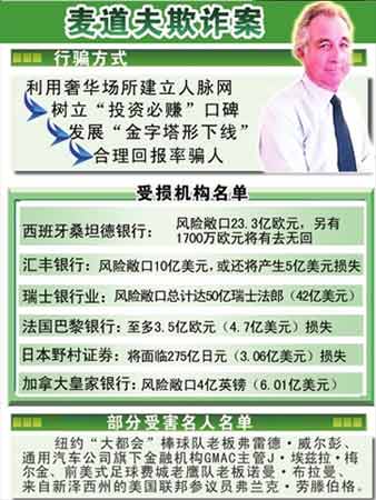 麥道夫的投資顧問公司以營(yíng)運(yùn)證券業(yè)務(wù)欺騙投資者,他在交易中虧損了投資者的錢,卻以其它投資者的本金,借詞作為投資回報(bào)支付給另一些投資者,導(dǎo)致投資者損失數(shù)百億美元。