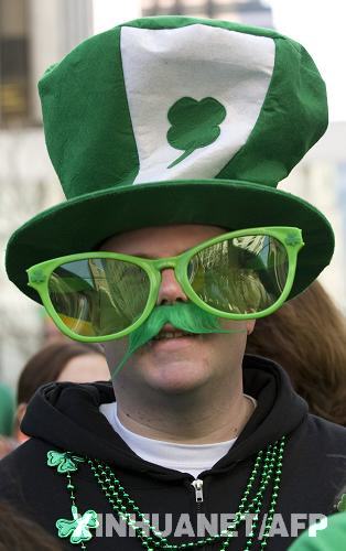 3月17日,在美國紐約,一名男子參加圣帕特里克節(jié)游行。當日,紐約舉行盛大游行活動慶祝圣帕特里克節(jié)。圣帕特里克節(jié)是愛爾蘭人紀念愛爾蘭守護神圣帕特里克的節(jié)日,至今已有1500多年歷史,這一節(jié)慶傳統(tǒng)被愛爾蘭移民帶入美國。新華社/法新