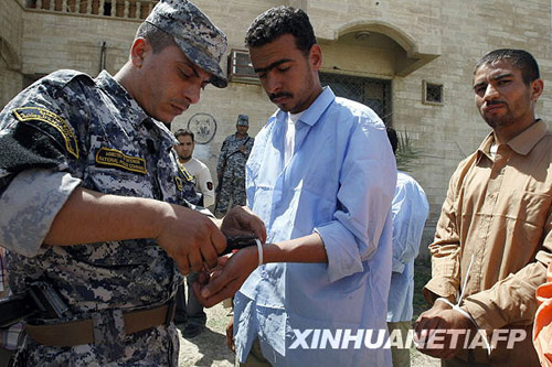 4月13日,在伊拉克首都巴格達(dá),一名伊拉克警官打開一名囚犯的手銬。新華社/法新