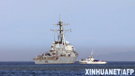 資料圖片:2008年11月22日,“巴里”號美軍驅(qū)逐艦停靠在格魯吉亞港口城市巴統(tǒng)附近。美國駐格魯吉亞使館發(fā)言人當(dāng)日說,“巴里”號驅(qū)逐艦隸屬美國海軍第六艦隊(duì),原駐扎在意大利那不勒斯,22日抵達(dá)巴統(tǒng)訪問。艦上沒裝載人道主義救援物資,也沒裝載軍事援助物資。 新華社/法新