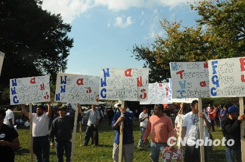 十月十三日,來自馬薩諸塞州、新罕布什爾州等的二十多個倡導移民改革團體組織數千人在國會山舉行綜合移民改革大型集會。圖為集會者高舉自己制作的標語,上面寫著“我們是工人不是罪犯”等標語。 中新社發(fā) 吳慶才 攝