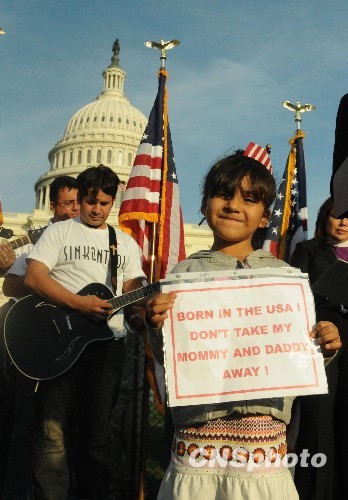 當地時間十月十三日,來自馬薩諸塞州、新罕布什爾州等的二十多個倡導移民改革團體組織數千人在國會山舉行綜合移民改革大型集會。圖為一名小女孩舉著“出生在美國,不要把我的錢和我的爸爸帶走”。 中新社發(fā) 吳慶才 攝