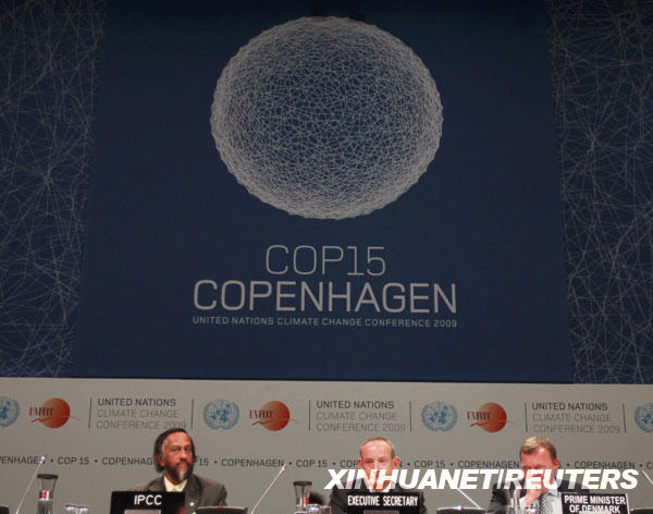 12月7日,在丹麥首都哥本哈根,聯合國政府間氣候變化專門委員會主席拉金德拉·帕喬里(左)、《聯合國氣候變化框架公約》秘書處執行秘書德博埃爾(中)與丹麥首相拉斯穆森出席開幕式。新華社/路透