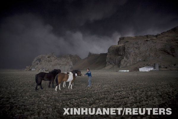 4月17日,在冰島一處農(nóng)場(chǎng),農(nóng)夫索拉林·奧拉夫松試圖安撫他的馬匹免受夾雜火山灰的烏云驚擾。冰島南部火山日前再次噴發(fā)所產(chǎn)生的大量火山煙塵嚴(yán)重影響了歐洲地區(qū)的空中交通,導(dǎo)致多個(gè)國家機(jī)場(chǎng)關(guān)閉,大量航班被取消。新華社/路透