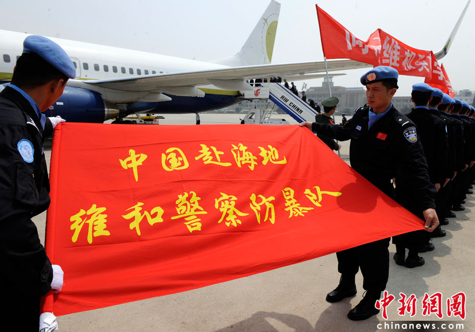 5月4日,中國第八支赴海地維和警察防暴隊全體隊員乘坐聯合國包機返回祖國。公安部副部長孟宏偉、政治部主任蔡安季前往機場迎接。 中新社發 劉震 攝