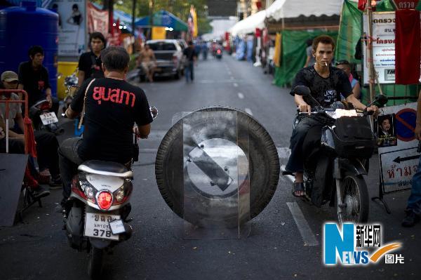 4月29日,當地男子騎摩托車出入位于泰國首都曼谷市中心的紅衫軍宿營地點。泰國總理阿披實4月30日說,政府將采取更加嚴厲的措施,阻止“紅衫軍”隨意出入集會地點曼谷市中心拉差巴頌路口。新華社/法新