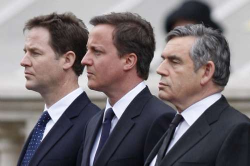 自民黨黨魁克萊格(左)、保守黨黨魁卡梅倫(中)及英國(guó)首相布朗三人正在為組閣問題而博弈。(資料圖)