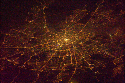 據外電10日報道,國際空間站的一名宇航員在太空拍攝了一組俄羅斯首都莫斯科的夜景圖,形如巨大發光蜘蛛網的城市輪廓顯得蔚為壯觀。