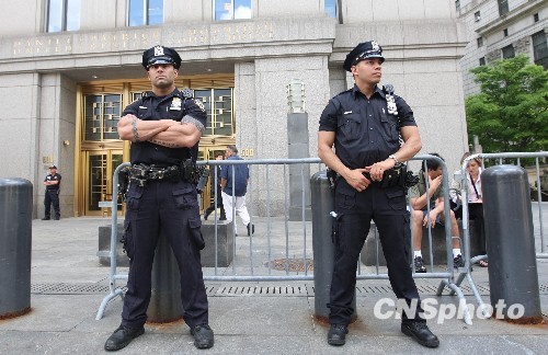 5月4日,紐約曼哈頓區(qū)聯(lián)邦法庭外,兩名警察嚴(yán)陣以待。據(jù)美國(guó)媒體報(bào)道,企圖制造5月1日美國(guó)紐約時(shí)報(bào)廣場(chǎng)汽車(chē)炸彈案的嫌犯費(fèi)薩爾·沙赫扎德,將于當(dāng)天在該法庭受審。據(jù)了解,費(fèi)薩爾·沙赫扎德將被控以恐怖主義和企圖使用大規(guī)模殺傷性武器等罪名。但有最新消息稱(chēng),由于嫌犯已經(jīng)對(duì)所犯罪行供認(rèn)不諱,并積極配合警方調(diào)查,4日的庭審可能將延期舉行。 中新社發(fā) 魏晞 攝