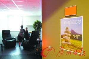 5月14日,一名法國電信公司的員工在公司休息室里接受按摩,休息室門口貼著一張關(guān)于禪的海報。