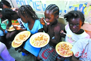 海地地震發生后,孩子們在一家慈善組織開設的餐館里免費用餐。