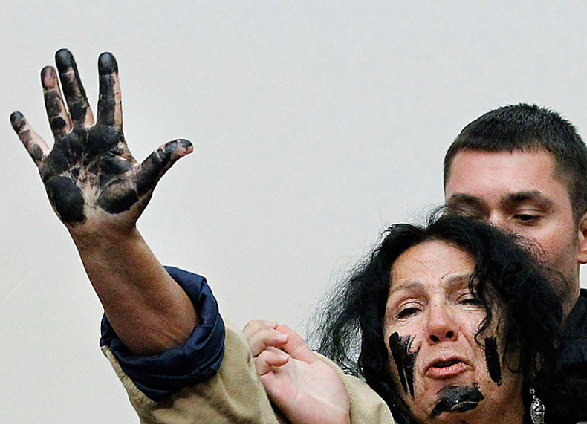 英國(guó)石油公司漏油事件聽證會(huì)上,警察逮捕了61歲的黛安威爾遜,她的雙手和臉部沾滿了“石油”。