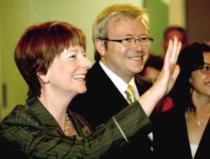 資料圖:澳大利亞現總理陸克文(右)和將擔任總理的吉拉德(左)在首都堪培拉參加會議。