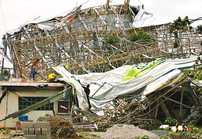 “康森”吹襲菲律賓期間,一個廣告牌倒塌,現場一片狼藉。
