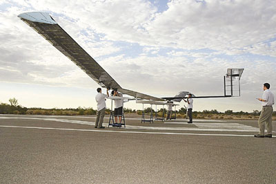 Zephyr由太陽能驅(qū)動(dòng),機(jī)翼上鋪滿紙張般薄的太陽能電池板,其鋰硫電池在日間儲(chǔ)存能量,使飛機(jī)足夠日夜飛行,成為史上首架能源自足的飛機(jī),而且不會(huì)造成污染。Zephyr翼展長22.5米,恍如史前巨鳥,機(jī)身用超輕碳纖維制造,僅重50公斤。創(chuàng)新的T字形機(jī)尾,按照空氣動(dòng)力學(xué)的原理設(shè)計(jì),可減輕空氣阻力。