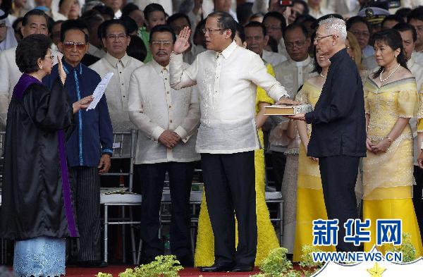 資料圖:6月30日,菲律賓當選總統貝尼尼奧·阿基諾三世(中)在首都馬尼拉宣誓就職,成為菲律賓第15任總統。菲律賓當日舉行新總統就職典禮,貝尼尼奧·阿基諾宣誓就任總統。新華社/路透