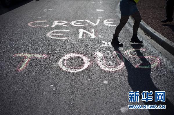 10月13日,在法國(guó)謝納,一女子走過(guò)寫有“人人都來(lái)參加罷工”的路面。新華社/法新