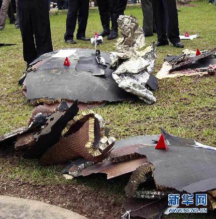 11月4日,在與新加坡隔海相望的印度尼西亞巴淡島,印尼警察查看從不同地區搜集到的澳洲航空公司客機墜落殘片。當日,一架澳航客機飛越印尼上空時引擎發生問題,飛行員被迫關閉引擎并在新加坡樟宜機場緊急迫降,所幸機上無人員傷亡。 新華社/路透
