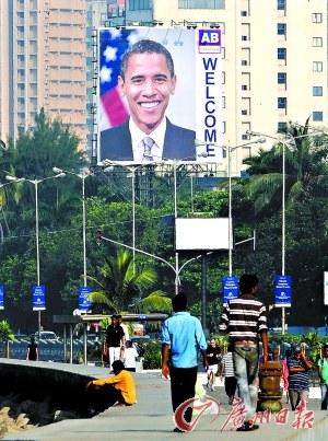 在孟買海邊的一條人行道上,張貼著“歡迎奧巴馬”的大幅海報。