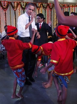 這些身穿鮮艷印度傳統(tǒng)服裝的孟買(mǎi)學(xué)生,當(dāng)天為遠(yuǎn)道而來(lái)的客人表演慶祝排燈節(jié)的舞蹈,他們搖擺著身姿,配以優(yōu)美的手勢(shì),感染著在場(chǎng)的觀眾。孩子們邀請(qǐng)奧巴馬夫人米歇爾一起舞蹈,米歇爾熱情的加入,奧巴馬則在一旁靜靜觀看。不過(guò)最后,奧巴馬也被拉起來(lái)共舞,但有些呆板生硬的動(dòng)作令人忍俊不禁。
