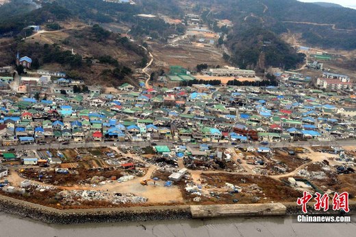 當地時間23日下午2時34分許,朝鮮向韓國一側的延坪島附近發射海岸炮炮彈,其中數枚落在有居民居住的島上,導致數十棟建筑起火或受損。圖為從空中拍攝的被炮彈擊中地區。