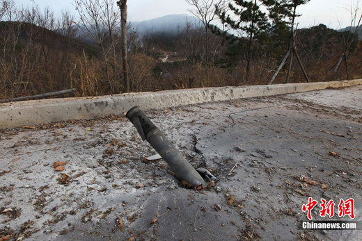 當地時間23日下午2時34分許,朝鮮向韓國一側的延坪島附近發射海岸炮炮彈,其中數枚落在有居民居住的島上,導致數十棟建筑起火或受損。圖為延坪島上一枚未爆炸的炮彈。