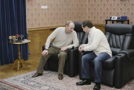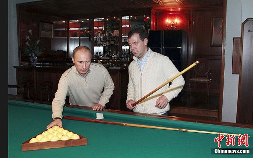 據(jù)路透社報道,俄羅斯總統(tǒng)梅德韋杰夫和總理普京3日晚在南部度假城市索契上演了一出令人詫異的“兄弟情”。兩人不但一起打臺球、看電影,甚至還都穿上了一件米色的毛衣。