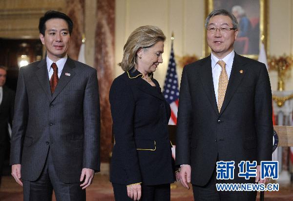 12月6日,在美國首都華盛頓國務院,美國國務卿希拉里·克林頓(中)、韓國外交通商部長官金星煥(右)和日本外務大臣前原誠司在舉行三邊會晤后共同會見記者。新華社記者張軍攝