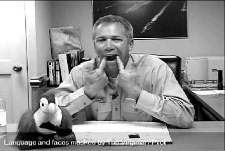 2011年1月2日,視頻截屏圖顯示:奧諾思(Owen Honors)艦長出現在淫穢戲劇小品錄像中。