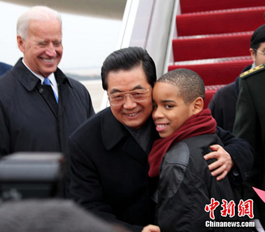 當(dāng)?shù)貢r(shí)間18日下午,中國(guó)國(guó)家主席胡錦濤乘坐的專機(jī)平穩(wěn)降落在美國(guó)華盛頓安德魯斯空軍基地,對(duì)美國(guó)進(jìn)行國(guó)事訪問。美國(guó)副總統(tǒng)拜登等高官赴機(jī)場(chǎng)迎接。一名美國(guó)兒童向胡錦濤獻(xiàn)花,胡錦濤親切地?fù)肀Я诉@個(gè)孩子。中新社記者 張朔 攝