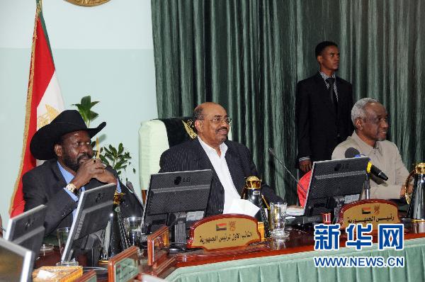 2月7日,蘇丹總統(tǒng)巴希爾(中)在喀土穆主持蘇丹部長(zhǎng)委員會(huì)會(huì)議。據(jù)蘇丹官方的國(guó)家電視臺(tái)報(bào)道,蘇丹總統(tǒng)巴希爾當(dāng)日頒布總統(tǒng)令,宣布承認(rèn)和接受蘇丹南部公民投票的最終結(jié)果。根據(jù)蘇丹公投委員會(huì)1月底公布的初步結(jié)果,在1月9日至15日舉行的蘇丹南部公投中,98.83%的選民支持南部地區(qū)從蘇丹分離。新華社發(fā)(穆罕默德·巴比克爾攝)