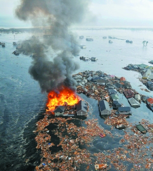 昨日,日本仙臺,經歷了地震和海嘯襲擊后,被淹沒的房屋起火。