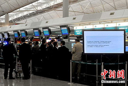 3月11日,日本東北部發(fā)生歷來最強烈的八點九級大地震。在香港機場國泰航空柜位,不少前往日本的旅客在著急查問相關情況,而LCD電屏不斷以英文顯示日本成田、羽田兩大機場情況。中新社發(fā) 鄧慶樂 攝