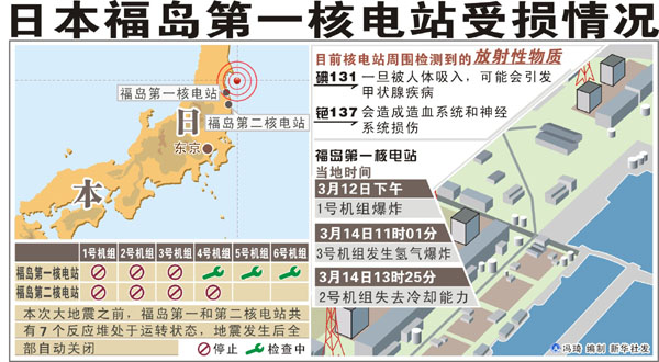 福島第一核電站的1號機組和3號機組在11日的地震發生后喪失冷卻功能,出現反應堆堆芯燃料部分熔毀,并先后發生氫氣爆炸。