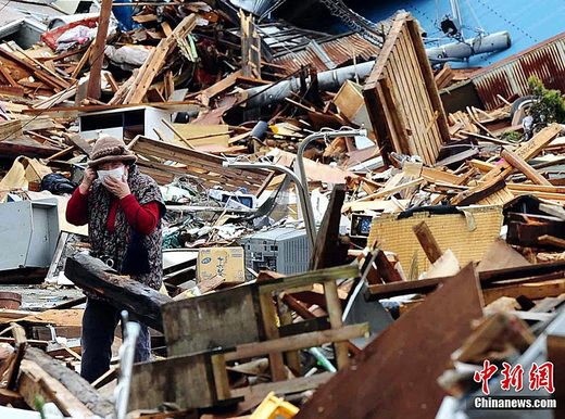 3月16日上午,一名老人在日本巖手縣大船渡市“3.11日本東北大地震”引發的大海嘯災區尋找可用物品。中新社發 侯宇 攝