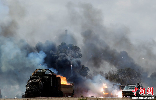 3月20日,班加西附近,忠于卡扎菲的武裝力量裝備遭遇聯軍襲擊。