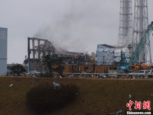 3月21日,東京電力公司公布的福島第一核電站3號(hào)反應(yīng)堆冒煙照片。當(dāng)天,東京電力公司宣布,下午3點(diǎn)55分前后,福島第一核電站3號(hào)反應(yīng)堆所在建筑物的東南側(cè)冒出灰煙,但是沒(méi)有聽(tīng)到爆炸聲。