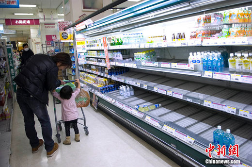 24日,由于東京部分自來水中檢測出的放射性碘超過嬰兒攝取上限,東京各大超市的飲用水瞬間被搶購一空。圖為東京港區(qū)某大型超市空空如也的飲用水柜臺。中新社發(fā) 孫冉 攝