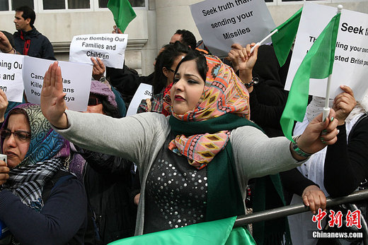 當(dāng)?shù)貢r間3月29日下午,約40個國家和國際組織的外長及代表在倫敦參加有關(guān)利比亞局勢的國際會議,上百名居住在倫敦的利比亞、卡塔爾等國抗議者在蘭卡斯特宮會場外示威,要求西方國家停止轟炸,停止干涉利比亞內(nèi)政。中新社發(fā) 魏群 攝
