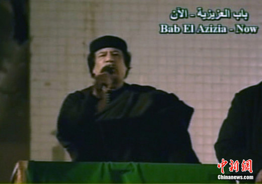 當(dāng)?shù)貢r(shí)間3月22日晚,多國(guó)部隊(duì)對(duì)利比亞發(fā)動(dòng)19日以來(lái)的第4輪空襲。22日深夜,利比亞領(lǐng)導(dǎo)人卡扎菲站在他被導(dǎo)彈襲擊官邸的陽(yáng)臺(tái)上向大批支持者發(fā)表演,指責(zé)西方國(guó)家對(duì)利比亞發(fā)動(dòng)的軍事行動(dòng)是“十字軍國(guó)家對(duì)伊斯蘭國(guó)家發(fā)動(dòng)的新十字軍東征”,并且表示他和他的支持者將在對(duì)反叛武裝和多國(guó)部隊(duì)的戰(zhàn)斗中奮戰(zhàn)到底,取得最后的勝利。圖為利比亞國(guó)家電視臺(tái)的截圖。