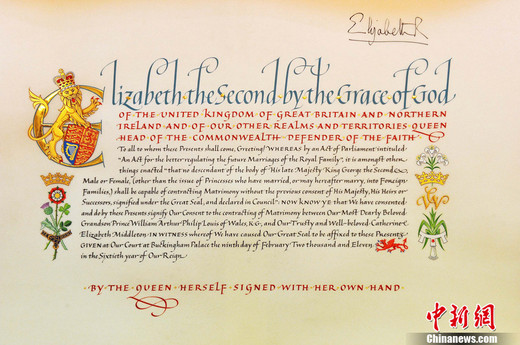 當地時間4月21日,英國女王官方同意威廉王子迎娶凱特-米德爾頓的官方文書發布。這份由女王親筆簽署、用花體字謄抄的詳盡準許通告,正式宣布同意“我們最為至愛的皇孫威爾士王子、嘉德騎士威廉-亞瑟-菲利普-路易斯,和我們信任的深受喜愛的凱瑟琳-伊麗莎白-米德爾頓結為連理”。
