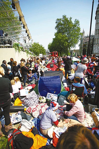 據香港《文匯報》報道,今天(29日)是本世紀以來英國王室的第一場婚禮,忠實的王室擁躉,反對君主制的人,湊熱鬧的游客……共同交織著這場世紀婚禮。在威廉王子和凱特舉行婚禮的西敏寺教堂外滿布米字旗和帳篷,有英國民眾從星期二開始就在觀眾區安營扎寨,占據最前排的位置觀看今日的婚禮。