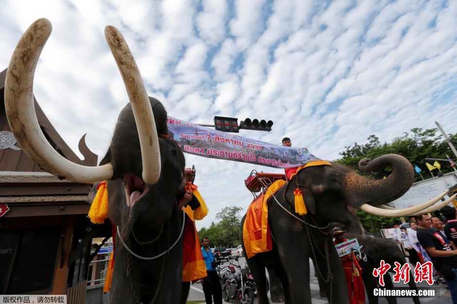 當?shù)貢r間8月1日,泰國大城府,當?shù)孛癖妳⒓雨P(guān)于8月7日新憲法公投的活動,有的民眾騎在大象背上舉著標語,并通過大象的鼻子分發(fā)傳單。