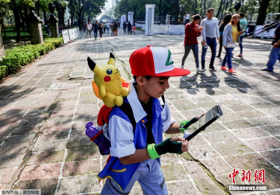 當(dāng)?shù)貢r(shí)間2016年8月21日,墨西哥舉辦“口袋妖怪日”,大量民眾COSPALY成口袋妖怪中的角色,在街頭抓精靈。圖為COS主角“小智”的男童在街頭。