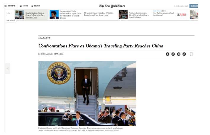 該報3日題為“奧巴馬剛到中國,對峙就爆發(fā)”的文章宣稱,奧巴馬乘坐的“空軍一號”在蕭山國際機(jī)場落地后,他并沒有從飛機(jī)的前門下機(jī),而是反常地從機(jī)尾下機(jī),且地面上也沒有紅毯;美國隨團(tuán)記者們走下飛機(jī),想記錄奧巴馬下飛機(jī)的一刻。但他們突然受到中國安保人員阻攔。隨后有白宮人員向該中國安保人員抗議,要求拍攝“我們的總統(tǒng)”。中國安保人員則回答,“這是我們的國家,我們的機(jī)場”。