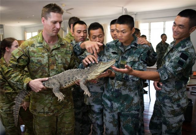 “科瓦里-2016”野外生存訓(xùn)練前夕,澳大利亞陸軍中士Dominic Hamon向中方參演官兵介紹野外求生中必不可少的“珍肴”——野生鱷魚。