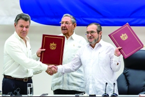 今年6月23日,在古巴領導人勞爾·卡斯特羅(中)的見證下,哥倫比亞總統桑托斯(左)和“哥武”指揮官蒂莫萊翁·希門尼斯在哈瓦那交換最終和平協議。新華社發