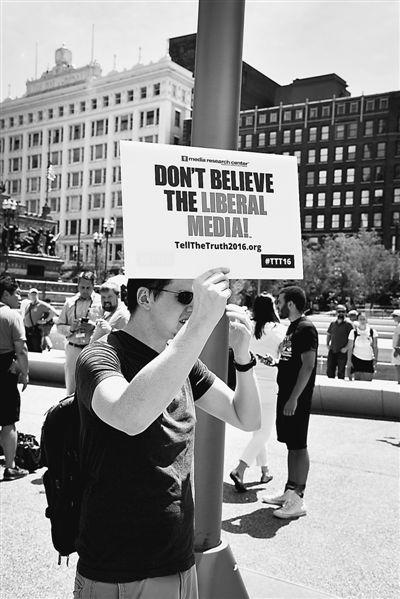 美國(guó)民眾在克利夫蘭街頭,高舉標(biāo)語(yǔ)抗議帶有偏見(jiàn)的媒體。